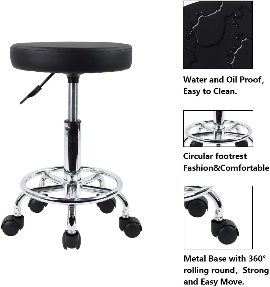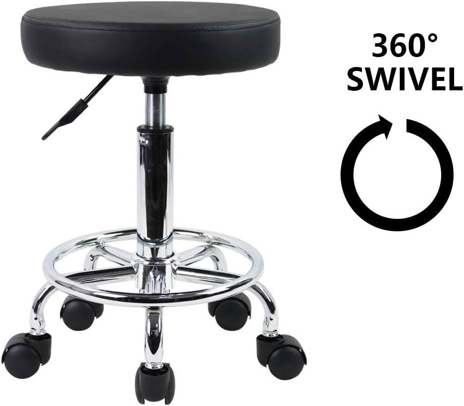 KKTONER PU Leather Round Rolling Stool with Foot Rest Swivel Height Adjustment Spa Drafting Salon Tattoo Work Office Massage Stools Task Chair Small (Black)